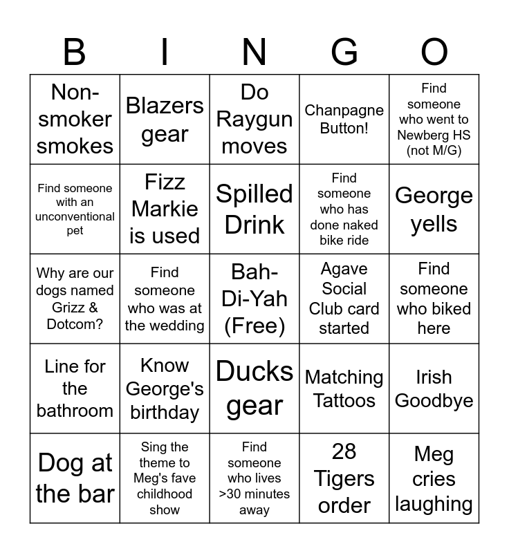 This bingo card has a free space and 28 words: Irish Goodbye, Partygoer does a shot, Find someone who has done naked bike ride, 28 Tigers order, Find someone with an unconventional pet, Do Raygun moves, Blazers gear, Line for the bathroom, Agave Social Club card started, Dog at the bar, Why are our dogs named Grizz & Dotcom?, Chanpagne Button!, Sing the theme to Meg's fave childhood show, Find someone who lives >30 minutes away, George yells, Find someone who went to U of O (not Meg), Know George's birthday, Fizz Markie is used, Spilled Drink, Ducks gear, Non-smoker smokes, Will Ferrell quote, Meg cries laughing, Find someone who was at the wedding, Find someone who biked here, Matching Tattoos, Find someone who went to Newberg HS (not M/G) and Pan con Queso order.