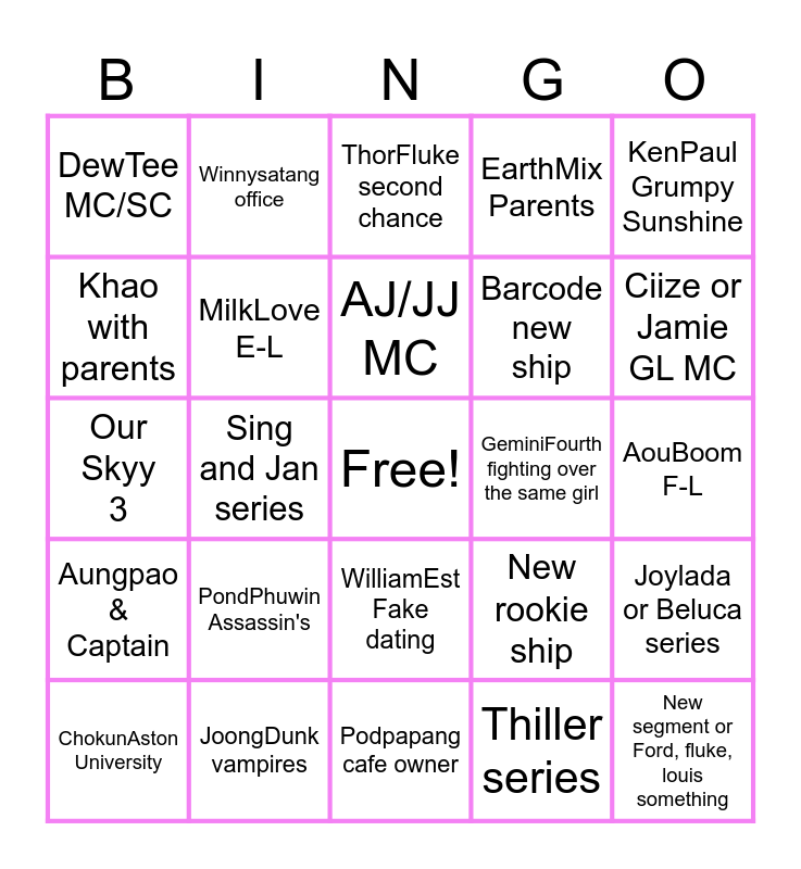This bingo card has a free space and 24 words: PondPhuwin Assassin's, JoongDunk vampires, AJ/JJ MC, ChokunAston University, KenPaul Grumpy Sunshine, DewTee MC/SC, Khao with parents, Winnysatang office, GeminiFourth fighting over the same girl, WilliamEst Fake dating, Barcode new ship, Our Skyy 3, New rookie ship, Joylada or Beluca series, MilkLove E-L, Thiller series, AouBoom F-L, ThorFluke second chance, Ciize or Jamie GL MC, Sing and Jan series, New segment or Ford, fluke, louis something, Aungpao & Captain, EarthMix Parents and Podpapang cafe owner.