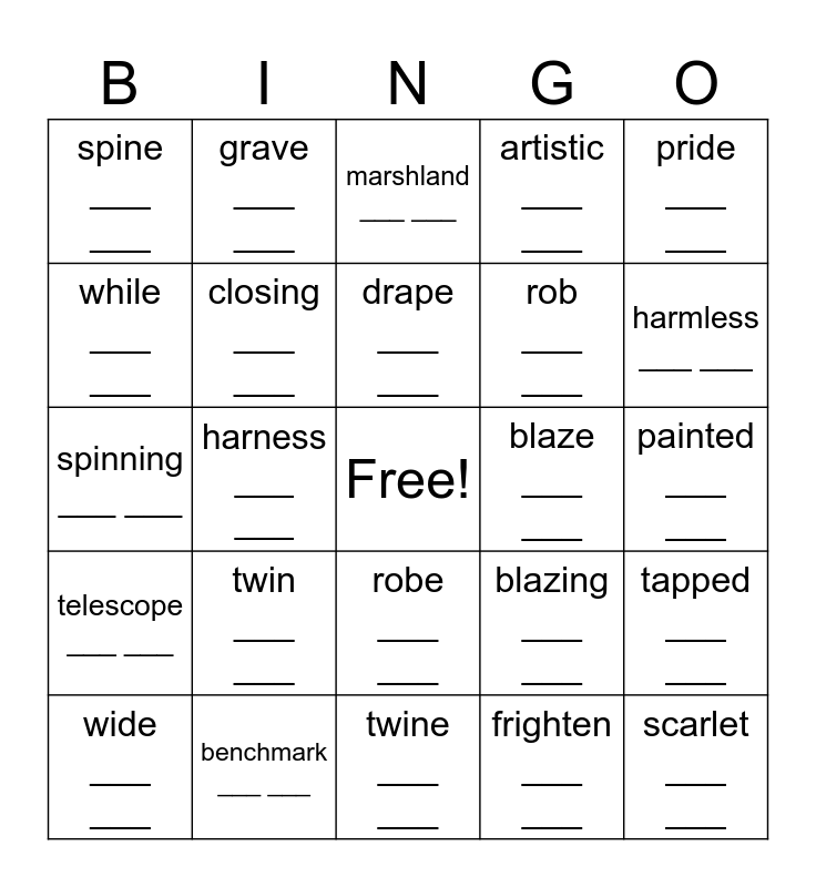 This bingo card has a free space and 25 words: twin ___ ___, twine ___ ___, drape ___ ___, wide ___ ___, pride ___ ___, spine ___ ___, while ___ ___, grave ___ ___, blaze ___ ___, robe ___ ___, rob ___ ___, spinning ___ ___, blazing ___ ___, tapped ___ ___, closing ___ ___, barked ___ ___, painted ___ ___, marshland ___ ___, harmless ___ ___, harness ___ ___, scarlet ___ ___, benchmark ___ ___, telescope ___ ___, artistic ___ ___ and frighten ___ ___.