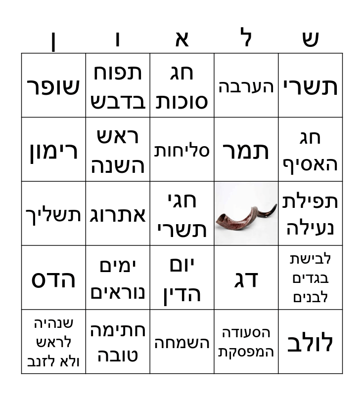 This bingo card has 1 images, a free space and 23 words: ימים נוראים, חתימה טובה, סליחות, שנהיה לראש ולא לזנב, תשרי, שופר, רימון, תפוח בדבש, יום הדין, תמר, תשליך, דג, לבישת בגדים לבנים, ראש השנה, הסעודה המפסקת, תפילת נעילה, חג סוכות, חג האסיף, אתרוג, לולב, הדס, הערבה and השמחה.