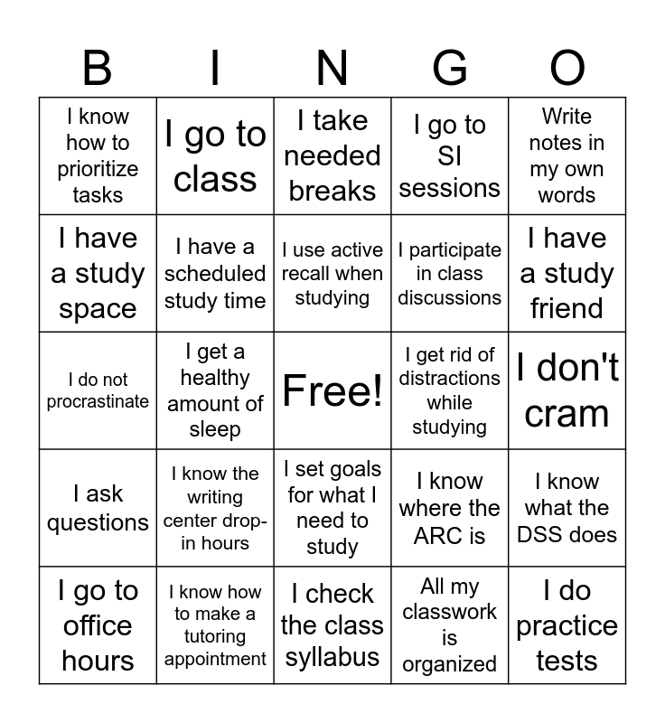 This bingo card has a free space and 24 words: I know the writing center drop-in hours, I know how to make a tutoring appointment, I use active recall when studying, I go to office hours, Write notes in my own words, I know how to prioritize tasks, I have a study space, I go to class, I get rid of distractions while studying, I set goals for what I need to study, I participate in class discussions, I do not procrastinate, I know where the ARC is, I know what the DSS does, I have a scheduled study time, All my classwork is organized, I don't cram, I take needed breaks, I have a study friend, I get a healthy amount of sleep, I do practice tests, I ask questions, I go to SI sessions and I check the class syllabus.