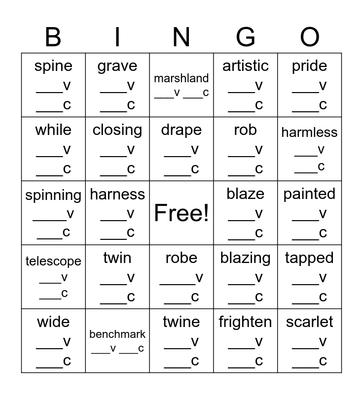 This bingo card has a free space and 25 words: twin ___v ___c, twine ___v ___c, drape ___v ___c, wide ___v ___c, pride ___v ___c, spine ___v ___c, while ___v ___c, grave ___v ___c, blaze ___v ___c, robe ____v ___c, rob ___v ___c, spinning ____v ___c, blazing ___v ___c, tapped ___v ___c, closing ___v ___c, barked ___v ___c, painted ___v ___c, marshland ___v ___c, harmless ___v ___c, harness ___v ___c, scarlet ___v ___c, benchmark ___v ___c, telescope ___v ___c, artistic ___v ___c and frighten ___v ___c.
