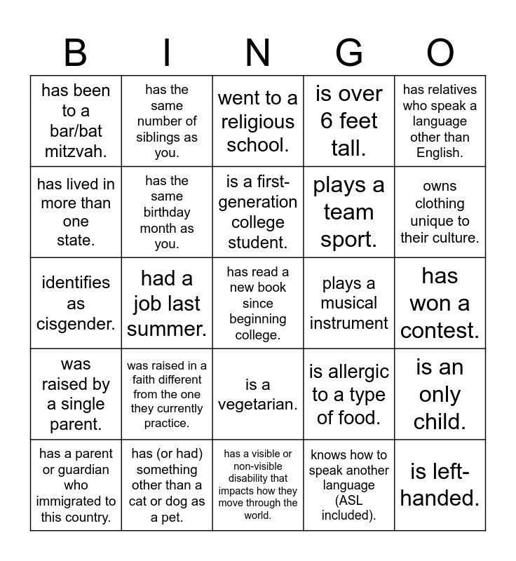 This bingo card has 25 words: was raised in a faith different from the one they currently practice., has a visible or non-visible disability that impacts how they move through the world., is a first-generation college student., has a parent or guardian who immigrated to this country., has relatives who speak a language other than English., has been to a bar/bat mitzvah., has lived in more than one state., has the same number of siblings as you., plays a musical instrument, is a vegetarian., plays a team sport., identifies as cisgender., is allergic to a type of food., is an only child., has the same birthday month as you., is left-handed., has won a contest., went to a religious school., owns clothing unique to their culture., had a job last summer., has read a new book since beginning college., has (or had) something other than a cat or dog as a pet., was raised by a single parent., is over 6 feet tall. and knows how to speak another language (ASL included)..