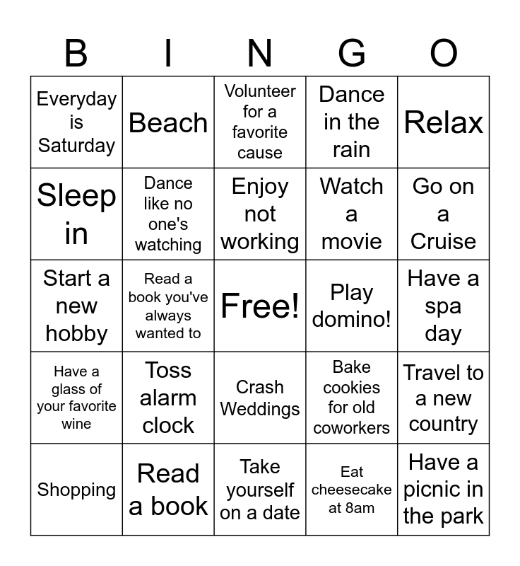 This bingo card has a free space and 24 words: Toss alarm clock, Read a book, Enjoy not working, Shopping, Relax, Everyday is Saturday, Sleep in, Beach, Play domino!, Crash Weddings, Watch a movie, Start a new hobby, Bake cookies for old coworkers, Travel to a new country, Dance like no one's watching, Eat cheesecake at 8am, Have a spa day, Volunteer for a favorite cause, Go on a Cruise, Read a book you've always wanted to, Have a picnic in the park, Have a glass of your favorite wine, Dance in the rain and Take yourself on a date.