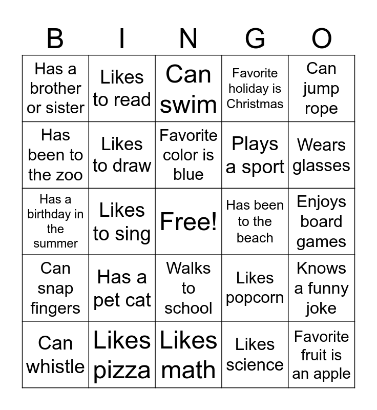 This bingo card has a free space and 24 words: Has a pet cat, Likes pizza, Favorite color is blue, Can whistle, Can jump rope, Has a brother or sister, Has been to the zoo, Likes to read, Has been to the beach, Walks to school, Plays a sport, Has a birthday in the summer, Likes popcorn, Knows a funny joke, Likes to draw, Likes science, Enjoys board games, Can swim, Wears glasses, Likes to sing, Favorite fruit is an apple, Can snap fingers, Favorite holiday is Christmas and Likes math.