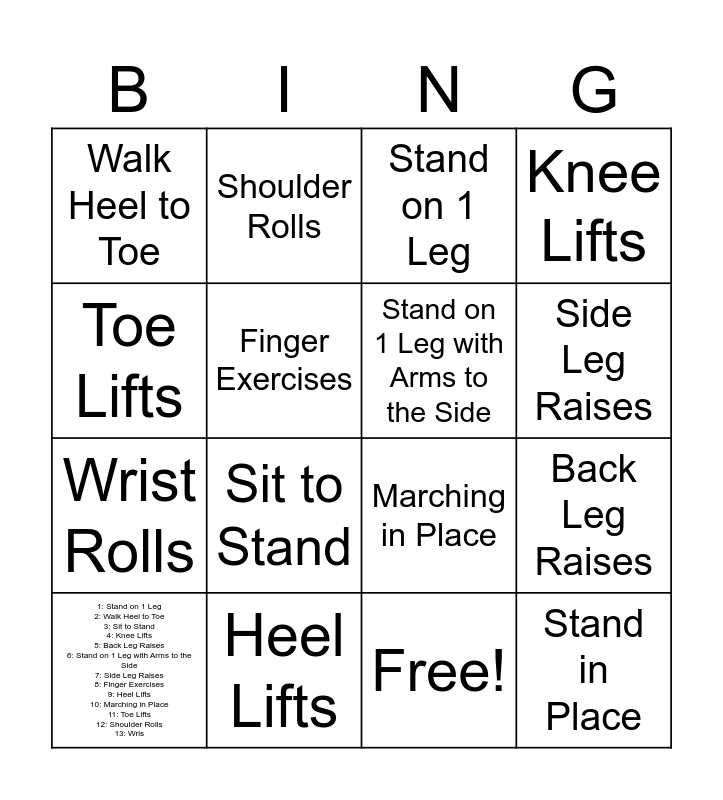 This bingo card has 17 words: Free!, 1: Stand on 1 Leg 2: Walk Heel to Toe 3: Sit to Stand 4: Knee Lifts 5: Back Leg Raises 6: Stand on 1 Leg with Arms to the Side 7: Side Leg Raises 8: Finger Exercises 9: Heel Lifts 10: Marching in Place 11: Toe Lifts 12: Shoulder Rolls 13: Wris, Stand on 1 Leg, Walk Heel to Toe, Sit to Stand, Knee Lifts, Back Leg Raises, Stand on 1 Leg with Arms to the Side, Side Leg Raises, Finger Exercises, Heel Lifts, Marching in Place, Toe Lifts, Shoulder Rolls, Wrist Rolls, Side Bends and Stand in Place.