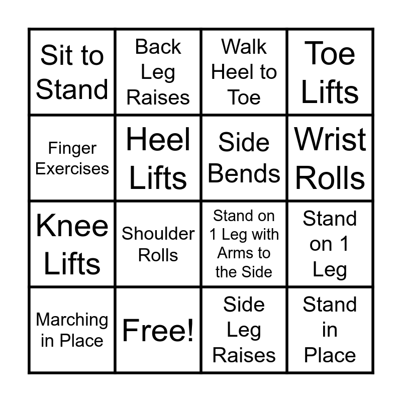 This bingo card has 16 words: Free!, Stand on 1 Leg, Walk Heel to Toe, Sit to Stand, Knee Lifts, Back Leg Raises, Stand on 1 Leg with Arms to the Side, Side Leg Raises, Finger Exercises, Heel Lifts, Marching in Place, Toe Lifts, Shoulder Rolls, Wrist Rolls, Side Bends and Stand in Place.
