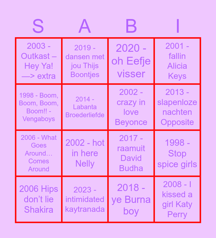 This bingo card has 46 words: 2006 - Kus gaat los Kus, 2006 Hips don’t lie Shakira, 2000 - op een onbewoond eiland - kvk, 2003 – Rock Your Body JT, 2000 – I’m Like a Bird - Nelly, 2011 – Video Games Lana del Ray, 2019 - dansen met jou Thijs Boontjes, 1991 - unfinished sympathy Massive Attack, 2014 - Labanta Broederliefde, 2013 - help me loose my mind disclosure, 2002 - crazy in love Beyonce, 2001 - fallin Alicia Keys, 2001 - Zoutelande Blof, 2004 - cowboy Chipz, 1999 - Heyah mama K3, 2002 - Dansplaat Brainpower, 2013 - slapenloze nachten Opposite, 2023 - intimidated kaytranada, 2024 - 360 Charlie xcx, 1998 - Boom, Boom, Boom, Boom!! - Vengaboys, 1998 - Stop spice girls, 1999 - say my name destinys child, 2003 - Outkast – Hey Ya! —> extra, 2006 - What Goes Around… Comes Around, 2022 - as it was Harry Styles, 2002 - hot in here Nelly, 2004 - this love Maroon 5, 2005 - Hollaback girl Gwen Stefani, 2005 - you’re beautiful James blunt, 2008 - I kissed a girl Katy Perry, 2007 - umbrella Rihanna, 2009 - I gotta feeling black eyed peas, 2016 - one dance drake, 2006 - vlinders brainpower, 2022 - de diepte S10, 2007 - About you now - Sugababes, 2018 - ye Burna boy, 2019 - Need it Kaytranada, 1998- music sounds better with you, 2016 - nights Frank Ocean, 1977 - dreams Fleetwood Mac, 2020 - oh Eefje visser, 2017 - raamuit David Budha, 1984 - Only you Steve Monite, 2020 - blinding lights the weekend and 1998 - do for love 2pac.