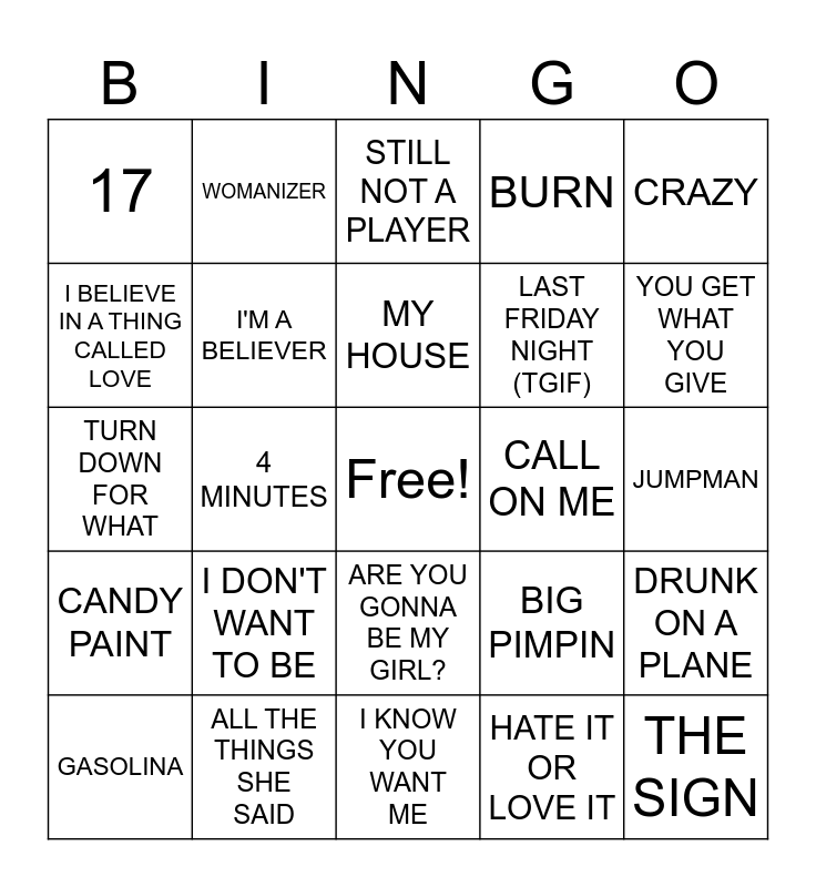 This bingo card has a free space and 32 words: HATE IT OR LOVE IT, DIRTY LITTLE SECRET, 4 MINUTES, DROP IT LIKE IT'S HOT, CANDY PAINT, I'M A BELIEVER, CRAZY, DRUNK ON A PLANE, WOMANIZER, CAN'T HOLD US, MY HOUSE, STILL NOT A PLAYER, CUPID'S CHOKEHOLD, LATCH, CALL ON ME, TAKE ME OUT, GASOLINA, TURN DOWN FOR WHAT, ARE YOU GONNA BE MY GIRL?, I DON'T WANT TO BE, BIG PIMPIN, KING KUNTA, JUMPMAN, ALL THE THINGS SHE SAID, THE SIGN, BURN, LAST FRIDAY NIGHT (TGIF), I BELIEVE IN A THING CALLED LOVE, 17, I KNOW YOU WANT ME, THAT DON'T IMPRESS ME MUCH and YOU GET WHAT YOU GIVE.