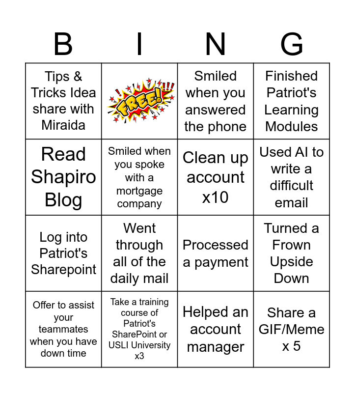 This bingo card has 1 images and 18 words: Processed a payment, Check in on a teammate you don't normally talk to, Smiled when you answered the phone, Share a GIF/Meme x 5, Turned a Frown Upside Down, Read Shapiro Blog, Helped an account manager, Tips & Tricks Idea share with Miraida, Log into Patriot's Sharepoint, Went through all of the daily mail, Smiled when you spoke with a mortgage company, Clean up account x10, Take a training course of Patriot's SharePoint or USLI University x3, Offer to assist your teammates when you have down time, Provide suggestions for your team huddle, Finished Patriot's Learning Modules, Used AI to write a difficult email and Follow/Like Shapiro on FB.