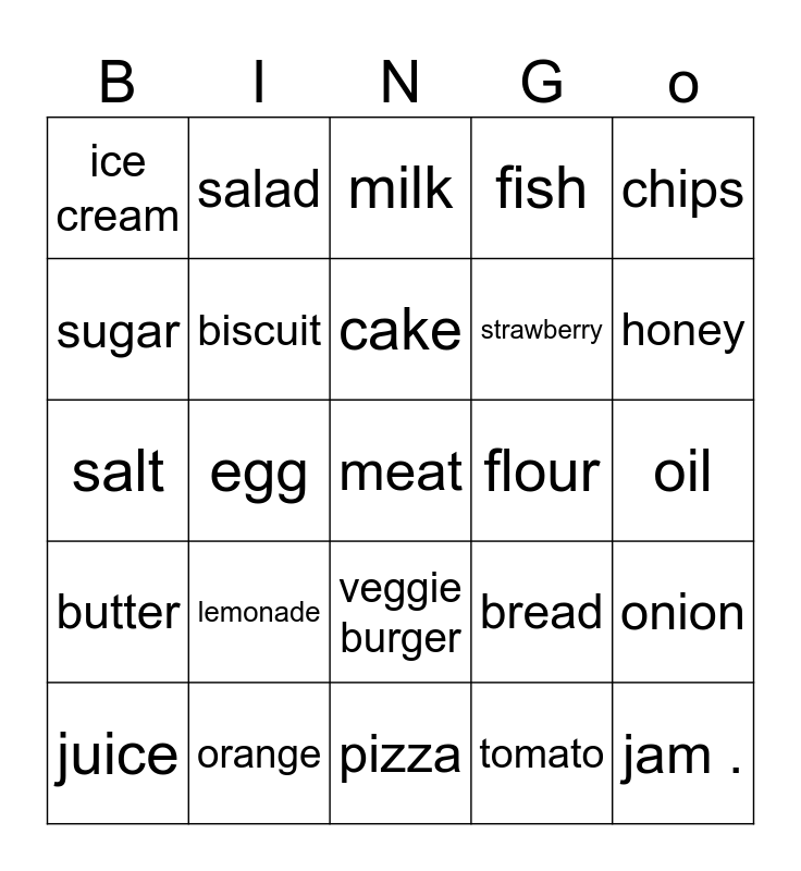 This bingo card has 36 words: Free!, apple, banana, biscuit, bread, butter, cake, cheese, chips, coffee, egg, fish, chicken, flour, honey, ice cream, jam ., lemonade, meat, milk, oil, onion, orange, juice, pizza, salad, salt, smoothie, strawberry, sugar, sushi, tea, tomato, veggie burger, water and yoghurt.