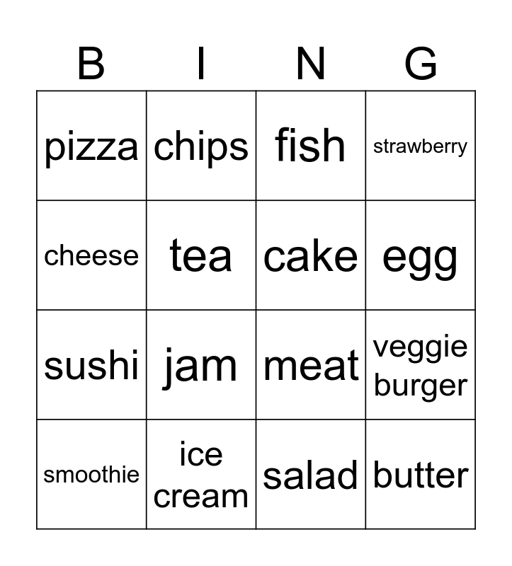 This bingo card has 34 words: apple, banana, biscuit, bread, butter, cake, cheese, chicken, chips, coffee, egg, fish, flour, honey, ice cream, jam, lemonade, meat, milk, oil, onion, orange juice, pizza, salad, salt, smoothie, strawberry, sugar, sushi, tea, tomato, veggie burger, water and yoghurt.