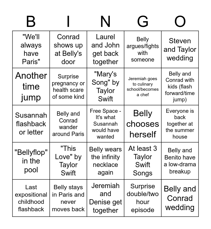 This bingo card has a free space and 24 words: "This Love" by Taylor Swift, Belly stays in Paris and never moves back, "Mary's Song" by Taylor Swift, Last expositional childhood flashback, Steven and Taylor wedding, "We'll always have Paris", Another time jump, Conrad shows up at Belly's door, Belly chooses herself, Belly wears the infinity necklace again, Jeremiah goes to culinary school/becomes a chef, Susannah flashback or letter, At least 3 Taylor Swift Songs, Belly and Benito have a low-drama breakup, Surprise pregnancy or health scare of some kind, Surprise double/two hour episode, Everyone is back together at the summer house, Laurel and John get back together, Belly and Conrad with kids (flash forward/time jump), Belly and Conrad wander around Paris, Belly and Conrad wedding, "Bellyflop" in the pool, Belly argues/fights with someone and Jeremiah and Denise get together.