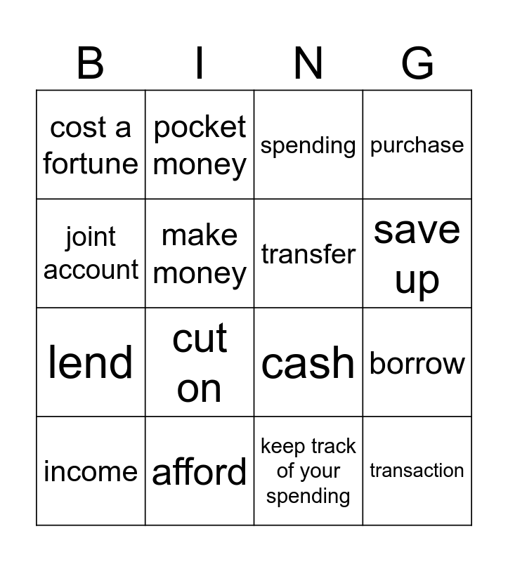 This bingo card has 16 words: afford, borrow, spending, cost a fortune, lend, pocket money, cash, keep track of your spending, joint account, make money, income, purchase, cut on, save up, transfer and transaction.