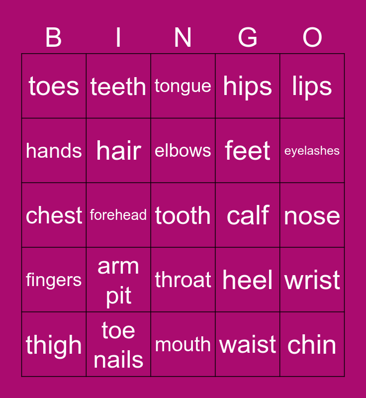 This bingo card has 45 words: ankle, tooth, finger nails, thigh, head, waist, tongue, palm, lips, toe nails, hips, calf, throat, arm pit, knuckles, mouth, legs, chest, eyelids, eyelashes, teeth, foot, eyebrows, toes, cheeks, nose, shin, face, heel, fingers, arms, wrist, neck, back, eyes, forehead, knees, stomach, chin, elbows, hands, feet, shoulders, hair and ears.