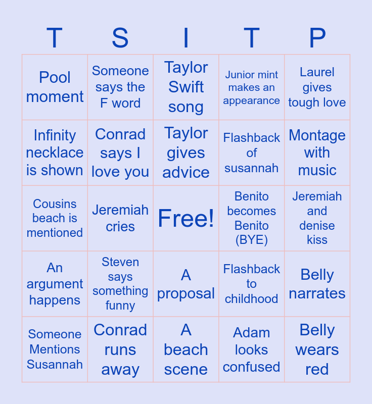 This bingo card has 1 images, a free space and 24 words: Someone Mentions Susannah, Steven says something funny, Taylor gives advice, Adam looks confused, Montage with music, Pool moment, Someone says the F word, Taylor Swift song, Flashback of susannah, Belly narrates, Cousins beach is mentioned, Conrad says I love you, Flashback to childhood, Belly wears red, Infinity necklace is shown, Conrad runs away, A beach scene, Junior mint makes an appearance, Jeremiah and denise kiss, An argument happens, Jeremiah cries, A proposal, Benito becomes Benito (BYE) and Laurel gives tough love.