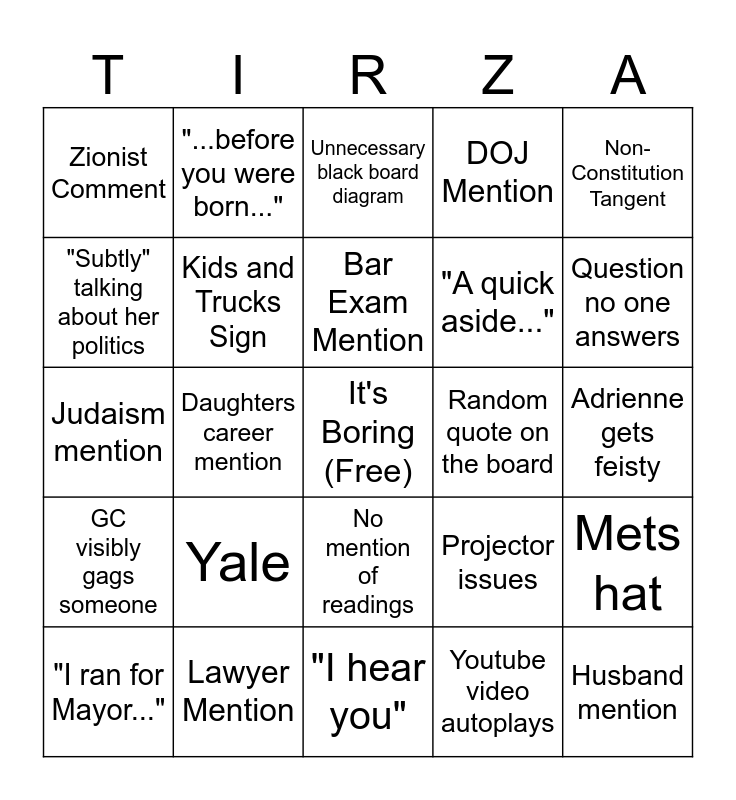 This bingo card has a free space and 24 words: Yale, Lawyer Mention, Bar Exam Mention, "I ran for Mayor...", Non-Constitution Tangent, Zionist Comment, "Subtly" talking about her politics, "...before you were born...", Random quote on the board, No mention of readings, "A quick aside...", Judaism mention, Projector issues, Mets hat, Kids and Trucks Sign, Youtube video autoplays, Adrienne gets feisty, Unnecessary black board diagram, Question no one answers, Daughters career mention, Husband mention, GC visibly gags someone, DOJ Mention and "I hear you".