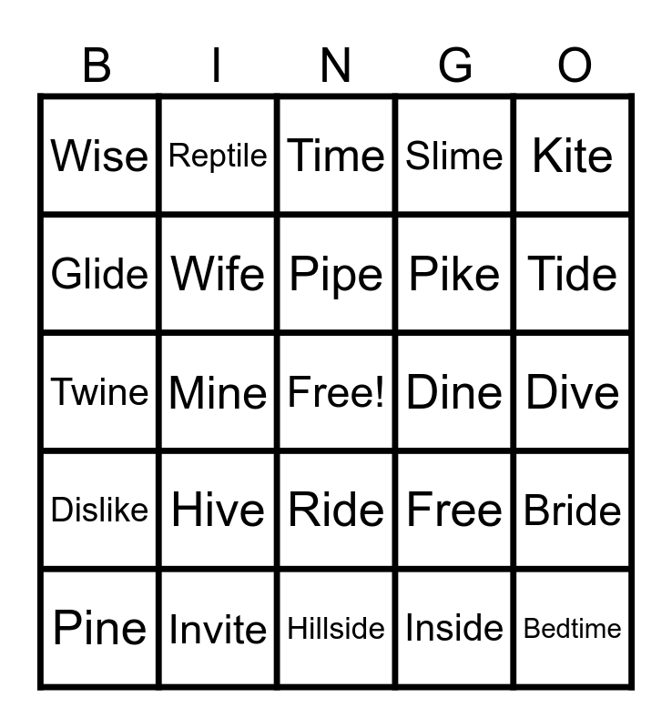 This bingo card has a free space and 25 words: Hive, Hillside, Pipe, Pine, Kite, Wise, Glide, Reptile, Dine, Ride, Pike, Twine, Free, Bride, Wife, Gripe, Dive, Time, Tide, Mine, Bedtime, Invite, Dislike, Slime and Inside.
