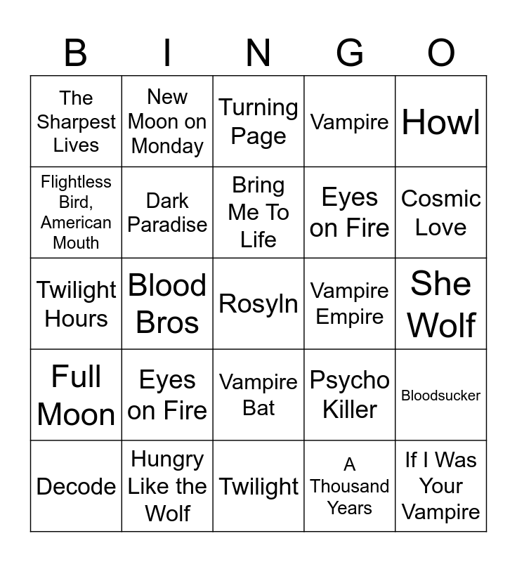 This bingo card has 44 words: twilight zone, Rosyln, Somebody's Watching Me, Decode, I Caught Myself, A Thousand Years, Turning Page, Mr. Brightsidde, Howl, Hungry Like the Wolf, Vampire, Vampire Empire, Vampire Bat, Eyes on Fire, Supermassive Black Hole, Twilight, Moral Kiosk, Twilight Hours, One Wild Night, Cosmic Love, New Moon on Monday, Vampire Blues, Biting Down, The Sharpest Lives, Vampires, Mummies And The Holy Ghost, She Wolf, Lone Wolf, Black Sheep, Psycho Killer, Full Moon, Harvest Moon, Bloodsucker, bloodonmyhands, In Cold Blood, Blood Bros, Bad Blood, Murder On The Dancefloor, If I Was Your Vampire, Bring Me To Life, Flightless Bird, American Mouth, Eyes on Fire, Twilight, Dark Paradise and Season of the Witch.