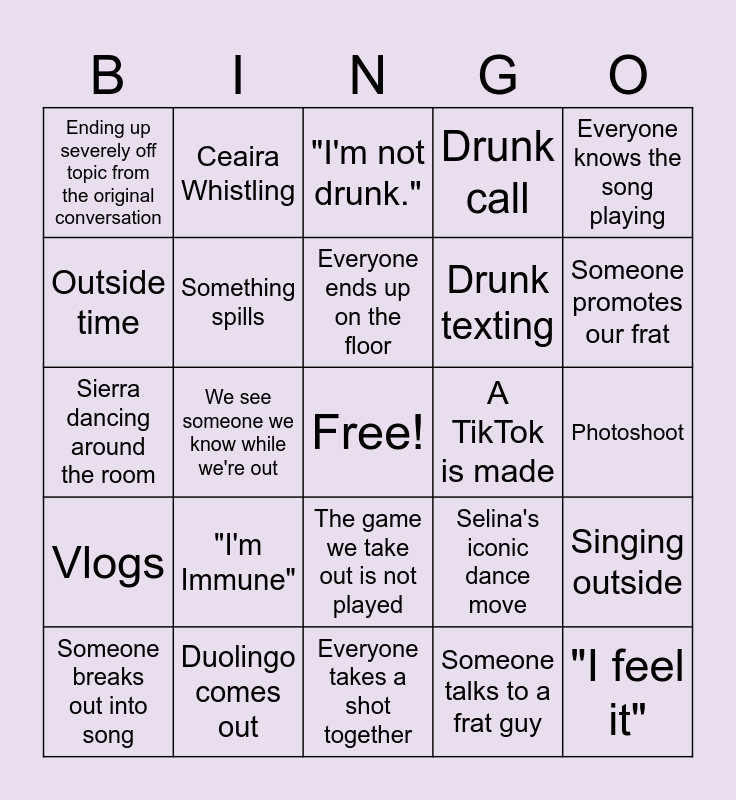 This bingo card has a free space and 24 words: "I'm Immune", Duolingo comes out, Everyone ends up on the floor, Someone breaks out into song, Everyone knows the song playing, Ending up severely off topic from the original conversation, Outside time, Ceaira Whistling, A TikTok is made, The game we take out is not played, Drunk texting, Sierra dancing around the room, Selina's iconic dance move, Singing outside, Something spills, Someone talks to a frat guy, Photoshoot, "I'm not drunk.", Someone promotes our frat, We see someone we know while we're out, "I feel it", Vlogs, Drunk call and Everyone takes a shot together.