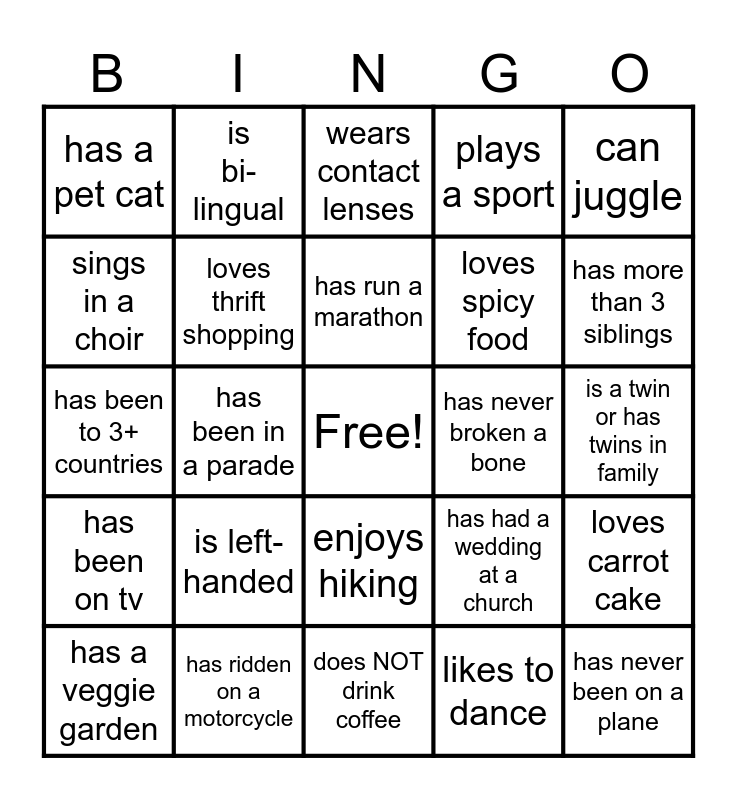 This bingo card has a free space and 25 words: is left-handed, does NOT drink coffee, has run a marathon, has a veggie garden, can juggle, has a pet cat, sings in a choir, is bi-lingual, has never broken a bone, enjoys hiking, loves spicy food, has been to 3+ countries, has had a wedding at a church, loves carrot cake, loves thrift shopping, has read a book this month, is a twin or has twins in family, wears contact lenses, has more than 3 siblings, has been in a parade, has never been on a plane, has ridden on a motorcycle, has been on tv, plays a sport and likes to dance.
