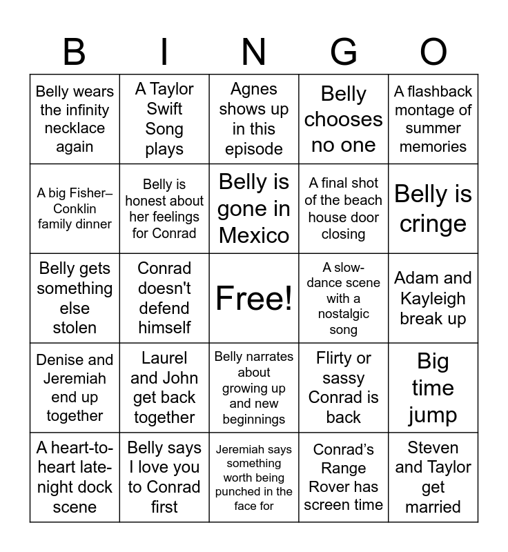 This bingo card has a free space and 24 words: Laurel and John get back together, Belly says I love you to Conrad first, Belly is gone in Mexico, A heart-to-heart late-night dock scene, A flashback montage of summer memories, Belly wears the infinity necklace again, A big Fisher–Conklin family dinner, A Taylor Swift Song plays, A slow-dance scene with a nostalgic song, Belly narrates about growing up and new beginnings, A final shot of the beach house door closing, Belly gets something else stolen, Flirty or sassy Conrad is back, Big time jump, Belly is honest about her feelings for Conrad, Conrad’s Range Rover has screen time, Adam and Kayleigh break up, Agnes shows up in this episode, Belly is cringe, Conrad doesn't defend himself, Steven and Taylor get married, Denise and Jeremiah end up together, Belly chooses no one and Jeremiah says something worth being punched in the face for.