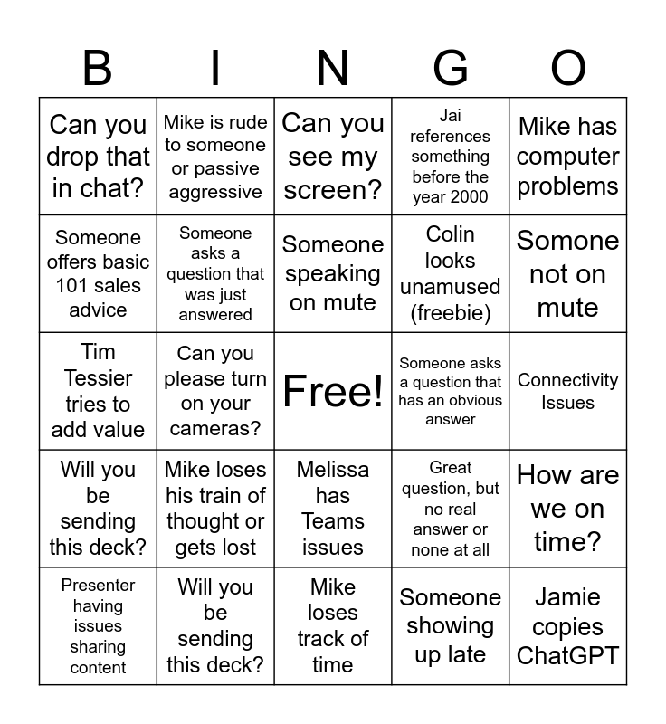 This bingo card has a free space and 24 words: Mike loses his train of thought or gets lost, Will you be sending this deck?, Someone speaking on mute, Presenter having issues sharing content, Mike has computer problems, Can you drop that in chat?, Someone offers basic 101 sales advice, Mike is rude to someone or passive aggressive, Someone asks a question that has an obvious answer, Melissa has Teams issues, Colin looks unamused (freebie), Tim Tessier tries to add value, Great question, but no real answer or none at all, How are we on time?, Someone asks a question that was just answered, Someone showing up late, Connectivity Issues, Can you see my screen?, Somone not on mute, Can you please turn on your cameras?, Jamie copies ChatGPT, Will you be sending this deck?, Jai references something before the year 2000 and Mike loses track of time.