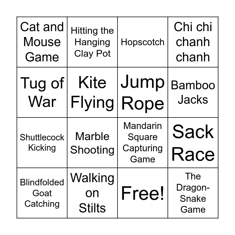 This bingo card has 17 words: Free!, Blindfolded Goat Catching, Hopscotch, Cat and Mouse Game, Marble Shooting, Chi chi chanh chanh, Sack Race, Jump Rope, Bamboo Jacks, Kite Flying, Walking on Stilts, Mandarin Square Capturing Game, Tug of War, Hitting the Hanging Clay Pot, Shuttlecock Kicking, Hide and Seek and The Dragon-Snake Game.