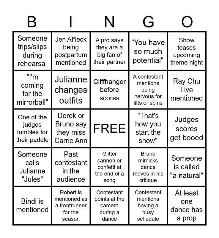 This bingo card has a free space and 30 words: Robert is mentioned as a frontrunner for the season, Julianne and Alfonso dance in the opener, Derek or Bruno say they miss Carrie Ann, A celebrity says "this is harder than I thought it would be", Someone trips/slips during rehearsal, A pro says they are a big fan of their partner, Julianne changes outfits, Glitter cannon or confetti at the end of a song, "That's how you start the show", Contestant points at the camera during a dance, Judges scores get booed, At least one dance has a prop, Contestant mentions having a busy schedule, Shirt ripped open during a dance, Ray Chu Live mentioned, Judges say "this is the best season yet", Bruno mimicks dance moves in his critique, Someone calls Julianne "Jules", Past contestant in the audience, Show teases upcoming theme night, One of the judges fumbles for their paddle, Bruno calls someone "darling", Jen Affleck being postpartum mentioned, A contestant mentions being nervous for lifts or spins, "I'm coming for the mirrorball", "You have so much potential", Someone is called "a natural", Bindi is mentioned, Cliffhanger before scores and Someone says they are "so out of breath".