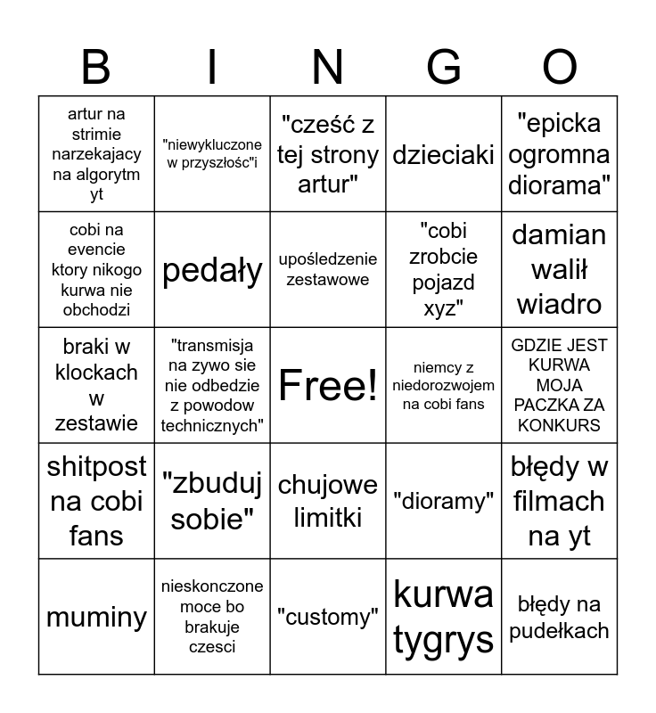 This bingo card has a free space and 24 words: "zbuduj sobie", nieskonczone moce bo brakuje czesci, upośledzenie zestawowe, muminy, "epicka ogromna diorama", artur na strimie narzekajacy na algorytm yt, cobi na evencie ktory nikogo kurwa nie obchodzi, "niewykluczone w przyszłośc"i, niemcy z niedorozwojem na cobi fans, chujowe limitki, "cobi zrobcie pojazd xyz", braki w klockach w zestawie, "dioramy", błędy w filmach na yt, pedały, kurwa tygrys, GDZIE JEST KURWA MOJA PACZKA ZA KONKURS, "cześć z tej strony artur", damian walił wiadro, "transmisja na zywo sie nie odbedzie z powodow technicznych", błędy na pudełkach, shitpost na cobi fans, dzieciaki and "customy".