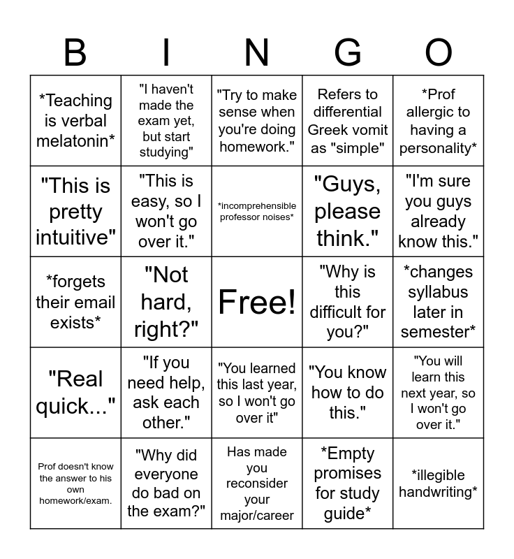 This bingo card has a free space and 24 words: "If you need help, ask each other.", "Why did everyone do bad on the exam?", *incomprehensible professor noises*, Prof doesn't know the answer to his own homework/exam., *Prof allergic to having a personality*, *Teaching is verbal melatonin*, "This is pretty intuitive", "I haven't made the exam yet, but start studying", "Why is this difficult for you?", "You learned this last year, so I won't go over it", "Guys, please think.", *forgets their email exists*, "You know how to do this.", "You will learn this next year, so I won't go over it.", "This is easy, so I won't go over it.", *Empty promises for study guide*, *changes syllabus later in semester*, "Try to make sense when you're doing homework.", "I'm sure you guys already know this.", "Not hard, right?", *illegible handwriting*, "Real quick...", Refers to differential Greek vomit as "simple" and Has made you reconsider your major/career.