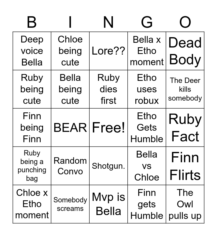 This bingo card has a free space and 24 words: Chloe x Etho moment, Random Convo, Ruby dies first, Finn gets Humble, Dead Body, Deep voice Bella, Chloe being cute, Lore??, Etho Gets Humble, Ruby Fact, Finn being Finn, Bella being cute, Bella vs Chloe, Finn Flirts, Ruby being cute, Somebody screams, Mvp is Bella, Bella x Etho moment, The Deer kills somebody, Ruby being a punching bag, BEAR, Shotgun., Etho uses robux and The Owl pulls up.
