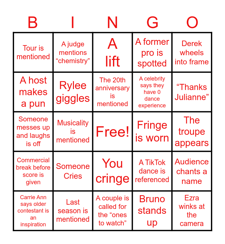 This bingo card has a free space and 24 words: Someone Cries, Last season is mentioned, The 20th anniversary is mentioned, Carrie Ann says older contestant is an inspiration, Derek wheels into frame, Tour is mentioned, A host makes a pun, A judge mentions “chemistry”, Fringe is worn, You cringe, A celebrity says they have 0 dance experience, Someone messes up and laughs is off, A TikTok dance is referenced, Audience chants a name, Rylee giggles, Bruno stands up, The troupe appears, A lift, “Thanks Julianne”, Musicality is mentioned, Ezra winks at the camera, Commercial break before score is given, A former pro is spotted and A couple is called for the “ones to watch”.