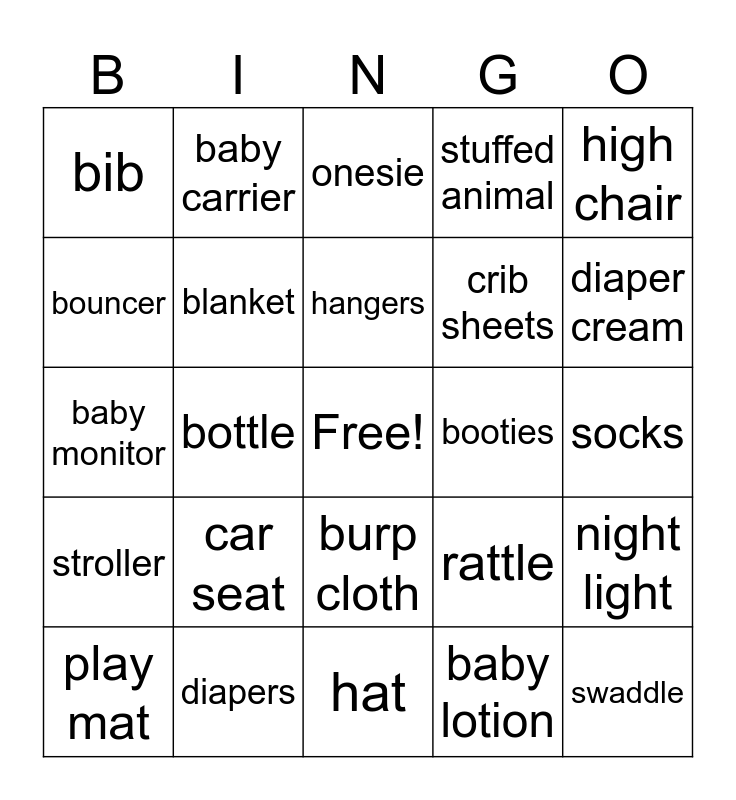 This bingo card has a free space and 30 words: diapers, wipes, bottle, pacifier, bib, onesie, blanket, burp cloth, booties, hat, socks, swaddle, baby lotion, baby shampoo, diaper cream, teether, rattle, stroller, car seat, high chair, baby monitor, changing pad, baby carrier, crib sheets, bouncer, stuffed animal, night light, play mat, hangers and bottle brush.