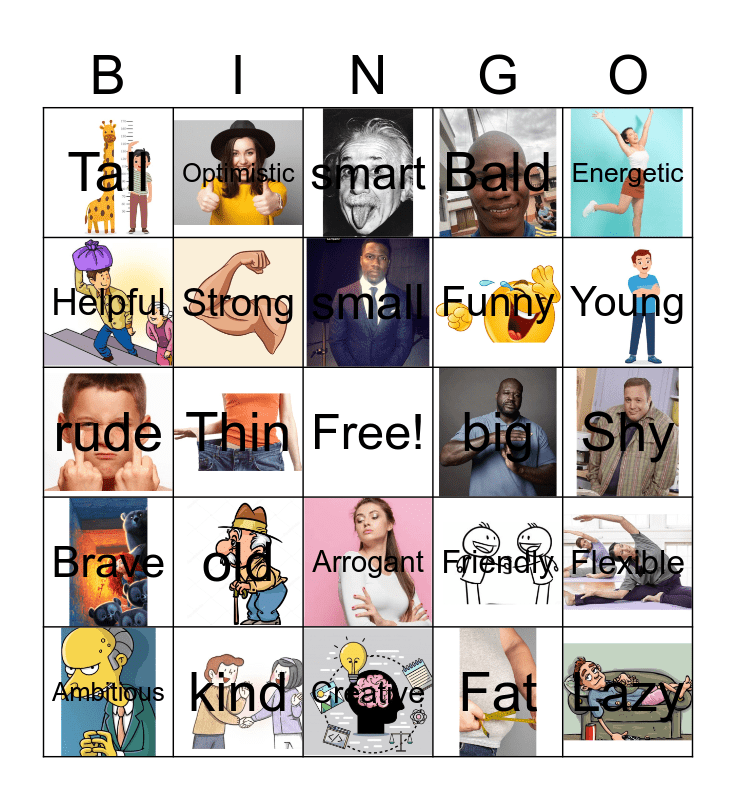 This bingo card has 24 images, a free space and 24 words: old, kind, small, Ambitious, Energetic, Tall, Helpful, Optimistic, big, Arrogant, Funny, rude, Friendly, Flexible, Strong, Fat, Shy, smart, Young, Thin, Lazy, Brave, Bald and Creative.