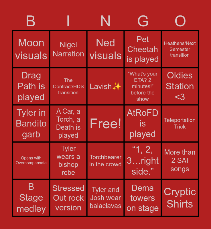 This bingo card has a free space and 24 words: Tyler wears a bishop robe, Stressed Out rock version, Lavish✨, B Stage medley, Heathens/Next Semester transition, Moon visuals, Drag Path is played, Nigel Narration, AtRoFD is played, Torchbearer in the crowd, “What’s your ETA? 2 minutes!” before the show, Tyler in Bandito garb, “1, 2, 3…right side.”, More than 2 SAI songs, The Contract/HDS transition, Dema towers on stage, Teleportation Trick, Ned visuals, Oldies Station <3, A Car, a Torch, a Death is played, Cryptic Shirts, Opens with Overcompensate, Pet Cheetah is played and Tyler and Josh wear balaclavas.