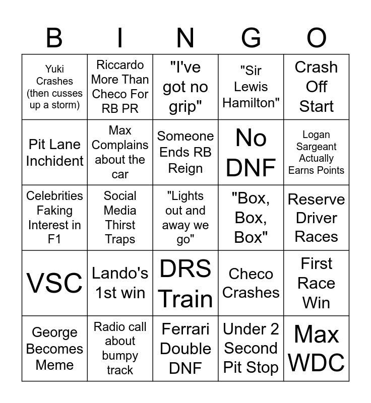 This bingo card has a free space and 24 words: Lando's 1st win, Radio call about bumpy track, Someone Ends RB Reign, George Becomes Meme, Crash Off Start, Yuki Crashes (then cusses up a storm), Pit Lane Inchident, Riccardo More Than Checo For RB PR, "Box, Box, Box", DRS Train, No DNF, Celebrities Faking Interest in F1, Checo Crashes, First Race Win, Max Complains about the car, Under 2 Second Pit Stop, Reserve Driver Races, "I've got no grip", Logan Sargeant Actually Earns Points, Social Media Thirst Traps, Max WDC, VSC, "Sir Lewis Hamilton" and Ferrari Double DNF.