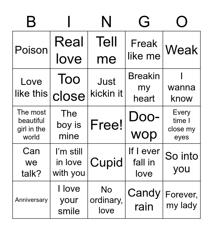 This bingo card has a free space and 59 words: Don’t walk away, I love your smile, I like the way, Can we talk?, Candy rain, If you love me, Too close, No Diggity, Breakin my heart, All cried out, Freak like me, They don’t know, Love like this, Pony, Hold on, Poison, Forever, my lady, Weak, Where my girls at, Just kickin it, Doo-wop, Tell me, Anniversary, So into you, Nobody supposed to be here, Twisted, Can’t you see?, Ascension, I wanna know, One in a million, No scrubs, Remember the time, I’m your baby tonight, Always be my baby, Real love, You make me wanna, No, no no, The boy is mine, End of the road, The most beautiful girl in the world, Breathe again, I’m still in love with you, Every time I close my eyes, I’d die without you, Hey Mr. DJ, U know what’s up, I gotta be, In my bed, Cupid, No ordinary, love, I apologize, Save the best for last, Back at one, Sweet lady, Freak me, If I ever fall in love, Don’t want to be a fool, Tender kisses and Last night.