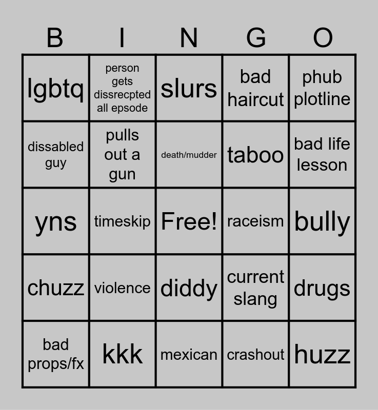 This bingo card has a free space and 24 words: violence, kkk, death/mudder, bad props/fx, phub plotline, lgbtq, dissabled guy, person gets dissrecpted all epsode, raceism, diddy, taboo, yns, current slang, drugs, pulls out a gun, crashout, bully, slurs, bad life lesson, timeskip, huzz, chuzz, bad haircut and mexican.