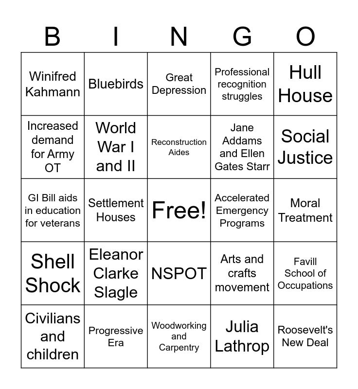 This bingo card has a free space and 24 words: Eleanor Clarke Slagle, Progressive Era, Reconstruction Aides, Civilians and children, Hull House, Winifred Kahmann, Increased demand for Army OT, Bluebirds, Accelerated Emergency Programs, NSPOT, Jane Addams and Ellen Gates Starr, GI Bill aids in education for veterans, Arts and crafts movement, Favill School of Occupations, World War I and II, Julia Lathrop, Moral Treatment, Great Depression, Social Justice, Settlement Houses, Roosevelt's New Deal, Shell Shock, Professional recognition struggles and Woodworking and Carpentry.