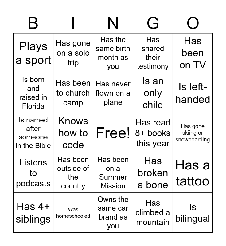 This bingo card has a free space and 31 words: Owns the same car brand as you, Has been to Fall Retreat, Knows how to code, Plays 2 or more instruments, Plays a sport, Has the same birth month as you, Has been to church camp, Has broken a bone, Has read 8+ books this year, Has climbed a mountain, Has gone skiing or snowboarding, Is bilingual, Has an exotic pet, Has met a celebrity, Is left-handed, Is a business major, Has a tattoo, Has been outside of the country, Listens to podcasts, Has been on a Summer Mission, Has been on TV, Prefers tea over coffee, Has 4+ siblings, Has gone on a solo trip, Is an only child, Is born and raised in Florida, Has shared their testimony, Is named after someone in the Bible, Was homeschooled, Has never flown on a plane and Has been to the west coast.