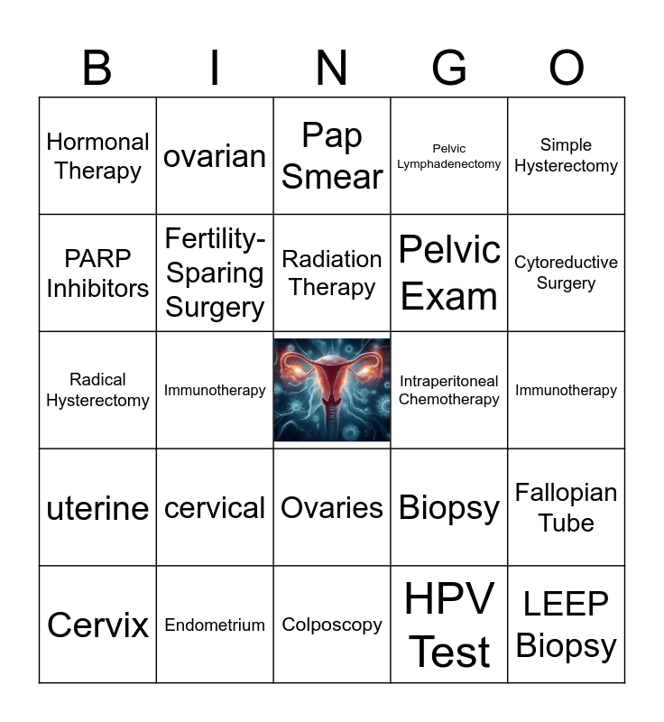 This bingo card has a free space and 24 words: cervical, Endometrium, Radiation Therapy, Cervix, Simple Hysterectomy, Hormonal Therapy, PARP Inhibitors, ovarian, Intraperitoneal Chemotherapy, Ovaries, Pelvic Exam, Radical Hysterectomy, Biopsy, Fallopian Tube, Fertility-Sparing Surgery, HPV Test, Immunotherapy, Pap Smear, Cytoreductive Surgery, Immunotherapy, LEEP Biopsy, uterine, Pelvic Lymphadenectomy and Colposcopy.