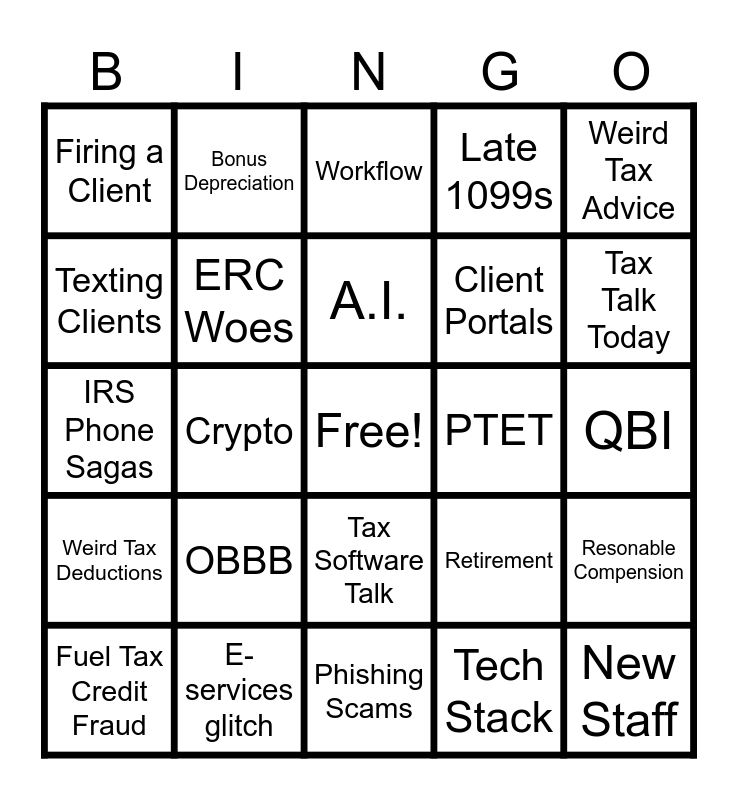 This bingo card has a free space and 40 words: Client who won't respond, IRS Phone Sagas, Forgotten 1095-A, ERC Woes, E-services glitch, Tax Software Talk, A.I., Referral Sources, Weird Tax Advice, Weird Tax Deductions, Crypto, Late 1099s, New Staff, QBI, PTET, OBBB, Summer tax project, Firing a Client, IRS Delays, Workflow, Resonable Compension, Tech Stack, Client Portals, Texting Clients, Weird client side hustles, Real Estate in an S-Corp, Tax Pun, WSEA Memory, Off Season Fun, Chat GPT, CE Classes, Fuel Tax Credit Fraud, WSEA January Update Seminar, Retirement, Tax Talk Today, Phishing Scams, Cybersecurity, Misclassified Contractor, Bonus Depreciation and Tik Tok Tax Advice.