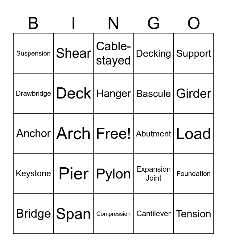 This bingo card has a free space and 29 words: Bridge, Truss, Arch, Beam, Suspension, Cable-stayed, Deck, Pier, Abutment, Span, Load, Tension, Compression, Cantilever, Girder, Tower, Pylon, Keystone, Support, Anchor, Expansion Joint, Roadbed, Bascule, Drawbridge, Decking, Shear, Foundation, Hanger and Caisson.