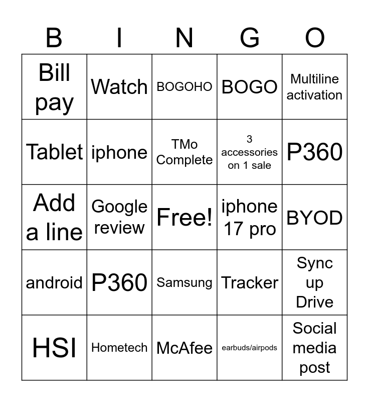 This bingo card has a free space and 24 words: P360, Hometech, TMo Complete, HSI, Multiline activation, Bill pay, Tablet, Watch, iphone 17 pro, Samsung, 3 accessories on 1 sale, Add a line, Tracker, Sync up Drive, iphone, earbuds/airpods, BYOD, BOGOHO, P360, Google review, Social media post, android, BOGO and McAfee.