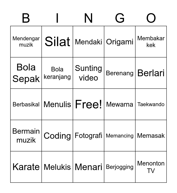 This bingo card has a free space and 24 words: Coding, Melukis, Sunting video, Karate, Membakar kek, Mendengar muzik, Bola Sepak, Silat, Mewarna, Fotografi, Berenang, Berbasikal, Memancing, Memasak, Bola keranjang, Berjogging, Taekwando, Mendaki, Berlari, Menulis, Menonton TV, Bermain muzik, Origami and Menari.