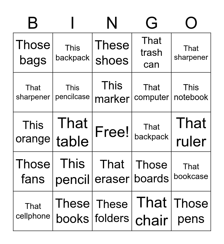 This bingo card has a free space and 24 words: This pencil, These books, This marker, That cellphone, That sharpener, Those bags, That sharpener, This backpack, That backpack, That eraser, That computer, This orange, Those boards, That bookcase, This pencilcase, That chair, That ruler, These shoes, This notebook, That table, Those pens, Those fans, That trash can and These folders.