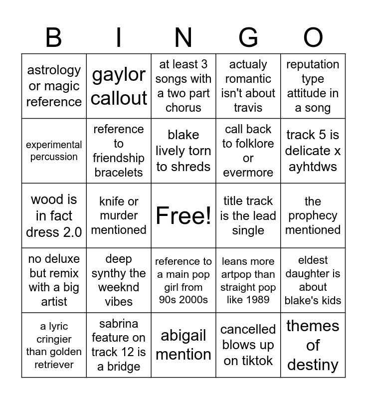 This bingo card has a free space and 24 words: deep synthy the weeknd vibes, sabrina feature on track 12 is a bridge, blake lively torn to shreds, a lyric cringier than golden retriever, reputation type attitude in a song, astrology or magic reference, experimental percussion, gaylor callout, title track is the lead single, reference to a main pop girl from 90s 2000s, call back to folklore or evermore, wood is in fact dress 2.0, leans more artpop than straight pop like 1989, eldest daughter is about blake's kids, reference to friendship bracelets, cancelled blows up on tiktok, the prophecy mentioned, at least 3 songs with a two part chorus, track 5 is delicate x ayhtdws, knife or murder mentioned, themes of destiny, no deluxe but remix with a big artist, actualy romantic isn't about travis and abigail mention.