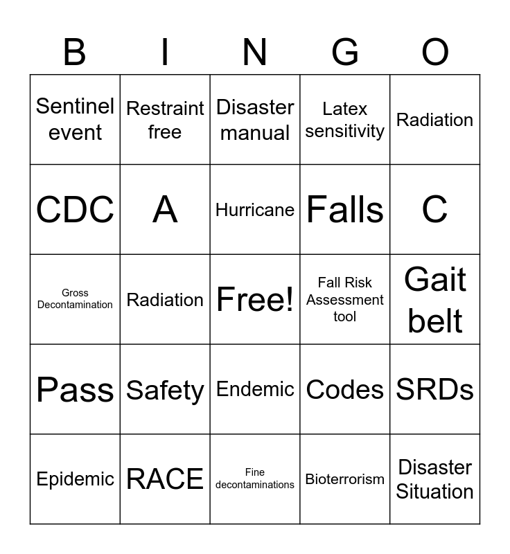 This bingo card has a free space and 24 words: Safety, RACE, Hurricane, Epidemic, Radiation, Sentinel event, CDC, Restraint free, Fall Risk Assessment tool, Endemic, Falls, Gross Decontamination, Codes, SRDs, A, Bioterrorism, Gait belt, Disaster manual, C, Radiation, Disaster Situation, Pass, Latex sensitivity and Fine decontaminations.