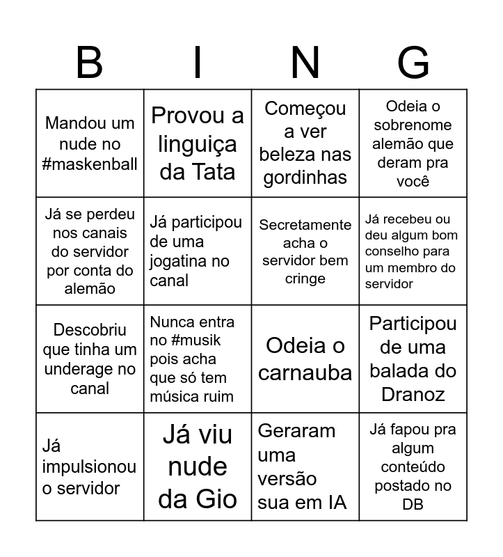 This bingo card has 16 words: Já viu nude da Gio, Participou de uma balada do Dranoz, Começou a ver beleza nas gordinhas, Mandou um nude no #maskenball, Descobriu que tinha um underage no canal, Provou a linguiça da Tata, Odeia o carnauba, Geraram uma versão sua em IA, Já se perdeu nos canais do servidor por conta do alemão, Já participou de uma jogatina no canal, Já impulsionou o servidor, Odeia o sobrenome alemão que deram pra você, Nunca entra no #musik pois acha que só tem música ruim, Já recebeu ou deu algum bom conselho para um membro do servidor, Secretamente acha o servidor bem cringe and Já fapou pra algum conteúdo postado no DB.